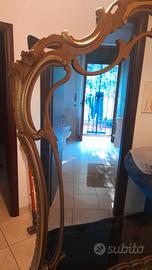 Grande specchiera vintage, cornice in legno dorato, piano di appoggio decorato. Completa di sgabello imbottito.