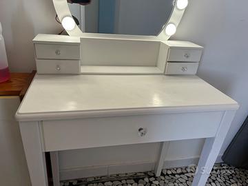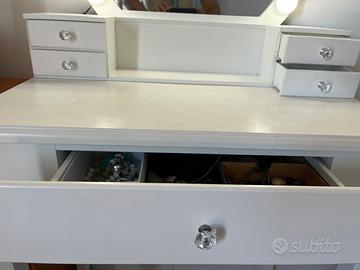 Dotata di molti spazi per riporre trucchi, oggetti e accessori: 4 cassetti laterali e un cassetto inferiore per oggetti più grandi.