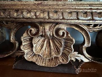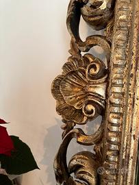 Antica specchiera stile ‘700, periodo 1945 circa, rettangolare da parete o da appoggio. In legno scolpito con foglia d’argento, decorata con tema naturale, foglie d'acanto riccioli e volute con intagli molto profondi, con doppia conchiglia dove alcuni punti lasciano trasparire il bolo rosso armeno sotto la foglia consumata dall’usura. Completa di specchio che presenta impercettibili strisci e con alcune macchie dell’età che impreziosiscono il tutto. Presenta un gancio posteriore per poterlo appendere.