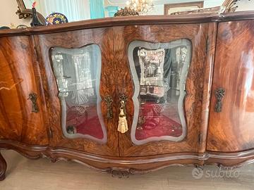2 credenze in radica di noce - una con 2 ante e tre profondi cassetti, l’altra con due ante e vetrinetta centrale.