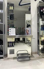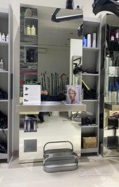 Vendo solo in Blocco 5 specchiere Marca AGV modello Podio Box per parruccheria complete di mensola e reggi phon, hanno espositori sul lato sinistro e cassettone verticale sul lato destro, poggia piedi incluso.