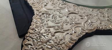 Si tratta di un articolo mai esposto in casa ricevuto in regalo. Specchiera a cuore di 254 Gr. a titolo 925/1000. La cornice in Argento è in bassorilievo. Lo specchio misura 20x24 mentre la cornice in fine velluto blu, misura 38 cm di base e 42 Cm di altezza. Non vi sono né graffi né danneggiamenti. Presente il suo imballo originale. Pezzo trattabile. Spedisco previo accordi ma non con subito.it.