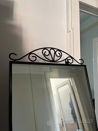 Vendo specchio a tutta altezza con cornice in metallo nero e decoro superiore. Elegante e stabile grazie al cavalletto posteriore, ideale per camera da letto o ingresso.