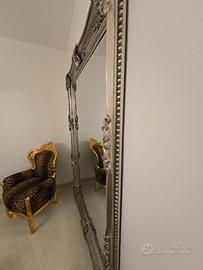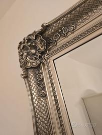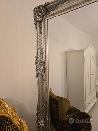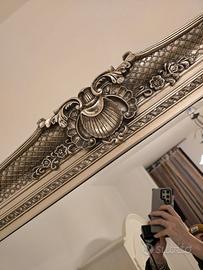 Vendo specchio grande a figura intera da parete in stile barocco, con cornice riccamente lavorata color argento anticato.