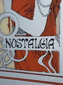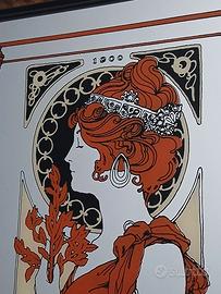Specchio Alphonse Mucha, in stile Art Nouveau, anni '70. Cornice in radica.