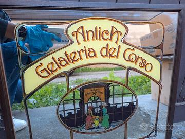 Vendo specchio Antica Gelateria del Corso, misure 50x40 appartenuto ad una pasticceria anni '90. Qualche segno del tempo. Bellissimi colori.