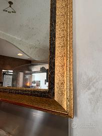 Specchio anticato di grandi dimensioni con cornice in foglia d’oro ed intagli decorativi sul perimetro interno della cornice.