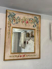 Specchio effetto invecchiato con cornice dorata e dipinti floreali. Misure: altezza 93 cm, lunghezza 73 cm, specchio 50x50 cm