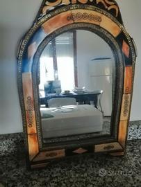Specchio, provenienza Marocco, non recente. Ha circa 30 anni. Tenuto molto bene. Misure 24X35. Da appendere. Pietra dura, ben rivestito. No plastica.