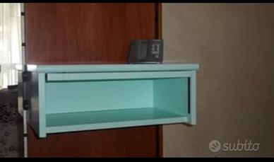 Vendo in ottimo stato specchiera attaccapanni da arredo per ingresso in legno impiallacciato colore noce con tre appendini porta abiti, mensola e cassetto di colore verde acqua come da foto.