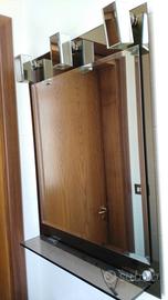 Vendesi specchio bagno di forma rettangolare con ripiano in cristallo e 3 faretti posizionati nella parte superiore.