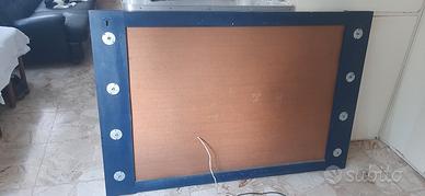 Buongiorno, vendo bellissimo specchio specchio per bagno, o altro ambiente, con illuminazione ai due lati da 4 lampade per parte regolabili per la densità della luce. Comprende anche una presa della corrente sottostante al telaio, un telaio strutturalmente forte, e di un blu Marino molto bello, mi dispiace che le foto non rendono onore alla sua ottima conservazione e bellezza, ma vi garantisco che è un bel pezzo da non perdere. Alto cm. 92, largo mt. 1,40, e profondo cm. 5, e pesa circa Kg. 28, comprende anche 8 lampade analogiche vintage, ritiro in loco, no spedizione, grazie per l'attenzione.