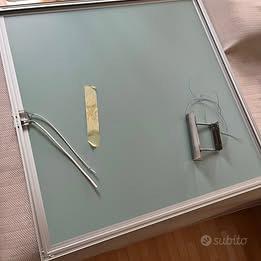 Specchio da bagno KIOS come nuovo, dimensioni 105 x 108 cm, da appendere con 2 tasselli (come un quadro), già personalizzato con collegamenti interruttore per il faretto e presa elettrica, più faretto alogeno lineare di design con vetro fumé unibile con 2 viti (fori sulla specchiera già realizzati).