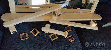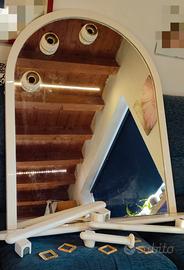 Vendo questo specchio da bagno laccato bianco, in buone condizioni. Con 2 porta asciugamani ed un porta rotolo abbinati. Rifiniture metalliche color oro. Interruttore luce e presa elettrica laterali.
