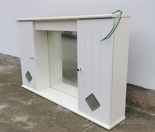 Mobiletto con specchio per bagno, bianco laccato, due ante laterali. Larghezza cm 96, altezza cm 62, profondità cm 17. misure specchio cm 48 x 52