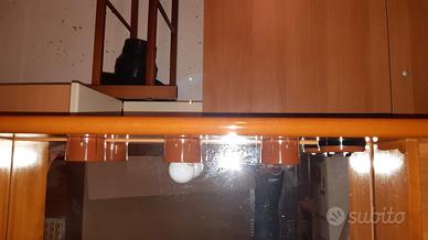 lungo 120cm, alto 70cm, profondo 15cm. color nocciola con tre luci e presa di corrente per asciuga capelli o rasoio elettrico. 2 ante apribili laterali con due vani ciascuno. non spedisco per via dello specchio