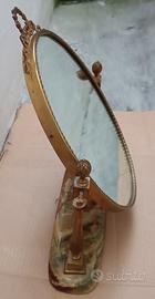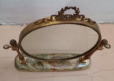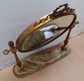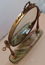 Specchio da Tavolo Basculante Vintage in Ottone e Onice ottime condizioni dimensioni dello specchio 32 x 42 lunghezza base 47 cm larghezza 13 altezza totale 54 cm Non spedisco