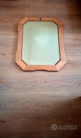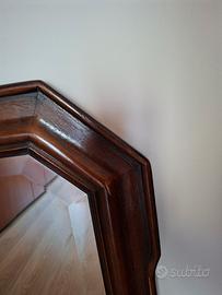 Bellissimo specchio bisellato di 3 cm con cornice lavorata in noce scuro che misura 8 cm per lato. Questo specchio rappresenta un' eleganza senza tempo. Misura 84 cm x 66 cm. Consegna preferibilmente a mano.