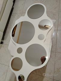 Design: Struttura irregolare in legno che ospita specchi rotondi.Materiali e Finiture: Il modello mostrato ha una finitura in laccato bianco. È stato prodotto anche in versioni in legno color wengé.Versatilità: Può essere installato sia in orizzontale che in verticale, rendendolo adatto per ingressi, soggiorni o camere da letto. Lo specchio può presentare dei piccoli difetti dovuto al tempo passato. Misure 98x50cm