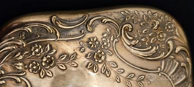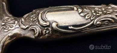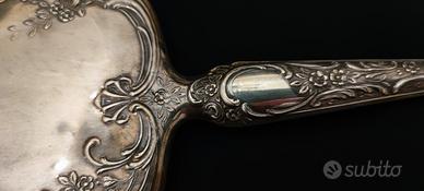 Splendido specchio da toilette antico da collezione di alta fattura artigianale, caratterizzato da una raffinata forma sagomata e un’impugnatura ergonomica finemente lavorata. L’intera cornice e il manico sono decorati con minuziosa tecnica di cesellatura a motivi floreali che conferiscono profondità e lucentezza all’oggetto. Punzone "stella" all’interno di ovale, simbolo identificativo degli argentieri italiani, non visibile il titolo dell'argento 800. Ottimo stato. Misure: lungh 30 x 15.