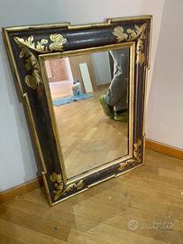 Vendo elegante specchio con cornice in legno intagliato e decorazioni dorate a foglia, dal design classico e raffinato.