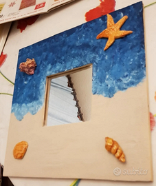 Specchio (cm 25,5×25,5) con cornice lavorata a mano effetto spiaggia e mare.