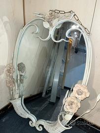 Vendo specchio con cornice in ferro battuto molto finemente lavorata come da foto, lo specchio è con fondo in argento di alta qualità, il telaio non ha segni di usura o di ruggine e lo specchio non è minimamente danneggiato. 500 euro consegna a mano zona Vicenza.