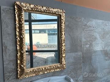 Specchio con cornice in foglia oro, misure larghezza cm.70, altezza cm.90. Nuovo, presente in esposizione presso la nostra sala mostra. In vendita SOTTOCOSTO per rinnovo locali.