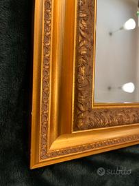 Specchio con cornice intarsiata, colore oro antichizzato, misure cm 102 x 90, cimpresa la cornice di 7 cm.