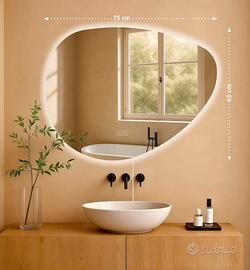 Specchio a parete asimmetrico con Led integrato dimmerabile e sistema anti-appannaggio. Nuovo, mai usato, in vendita perché troppo grande rispetto alle dimensioni del bagno. Misure 75x65 cm Acquistato da CLP Store Prezzo originale 95 euro