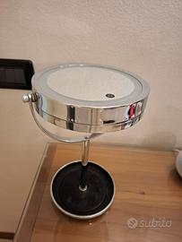 Vendo Specchio da tavolo doppia funzionalità normale/con lente ingrandimento per trucco. Con luce a batterie. Diametro cm.17. Altezza Totale cm.34. Base con vano porta oggetti.