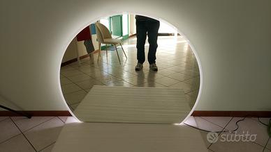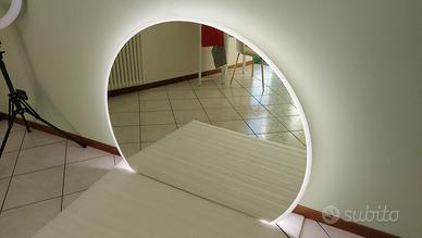Specchio a semicerchio con luci led temperatura fredda ; comprato sul sito di Deghi a fine gennaio 2026 e mai usato perché troppo grande per il locale. È rimasto imballato nel suo rivestimento di polistirolo e plastica, l'unica cosa che manca è la scatola. Le misure sono esattamente quelle riportate nella foto dal sito: 130 cm il punto di larghezza massima, la base misura 102,5 cm, l'altezza è di 105 cm e lo spessore 2, 8 cm. I led laterali creano un effetto di luce diffusa molto elegante e lo specchio non deforma le figure. 220/240 volt .
