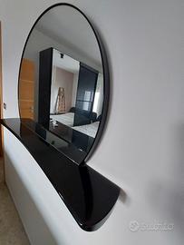 Specchio rotondo di diametro 79 cm circa. Ha una comoda mensola alla base ideale per metterci una foto o altro. La mensola semi curva è circa 100 cm x 15 cm. lo soecchio è perfetto, La mensola leggermente segnata (graffietti da polvere) essendo laccata nera. Ritiro sul posto