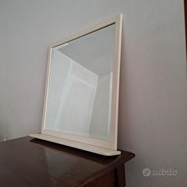 specchio con cornice e mensola in legno dipinto in bianco. Larghezza specchio con cornice 75 cm altezza 77 cm, larghezza mensola 80, profondità 11 cm.