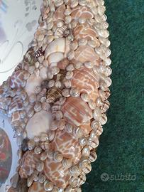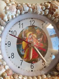 Specchio anni ottanta indiano con orologio funzionante con cornice in conchiglie madreperla. Dimensioni: 47 x 32 x 3 cm, Diametro dell'orologio: 10 cm, dimensioni dello specchio: 28 x 20 cm. MAI USATO. Funzionamento a pila. Dotato di anello in ottone che consente di appenderlo.