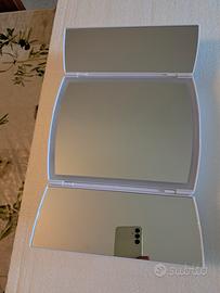 Specchio con luce di diversa intensità , con pile ( non incluse ) e cavo usb ( incluso ). H 24 P 7 L 20 chiuso