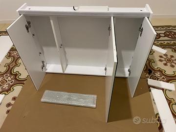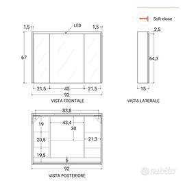 Misure: 91x15x67h cm. Ha tre ante a specchio, illuminazione LED integrata con doppio comando (interruttore a muro o interno), e una presa elettrica nel mobile molto comoda per phon o rasoio. Le mensole in vetro sono ancora sigillate nell'imballo originale. Include tutto il necessario per il fissaggio. Ritiro a mano.