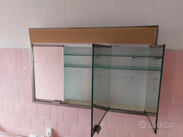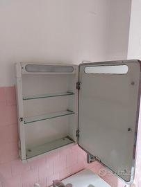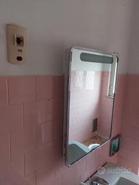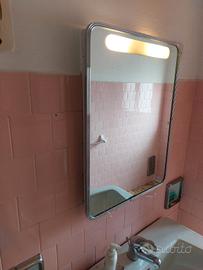 È disponibile un set da bagno vintage. Un specchio contenitore. Ha luce superiore funzionante. La un lato è presente anche spina per la presa. Si completa con un "mensola"-"comodino" sempre da appendere sul muro.