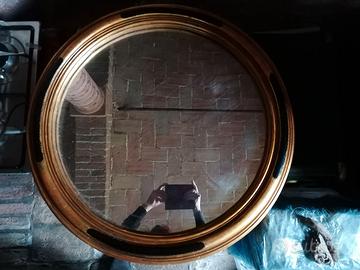 Specchio vintage tondo diametro 74cm. Lo specchio è rovinato andrebbe cambiato Vedere particolare foto cornice. Non spedisco