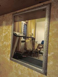 Specchio da parete rettangolare con cornice in legno con funitura argentata.
