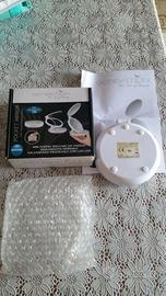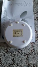 Vendo specchio comestico ingrandente Sensation Pocket Mirror marca Macom da borsetta. Richiudibile a pantografo con specchio normale e secondo specchio ad ingrandimento 7X con cornice di led per illuminazione che funzionano con 4 pile AAA da 1,5 volt con interruttore di accensione. Perfetto come nuovo completo di busta da imballaggio pneumatica, istruzioni e scatolo originale. Passato ad altro specchio a 10X a causa peggioramento gradazione presbiopia della consorte utilizzatrice.