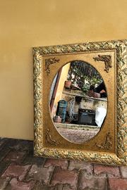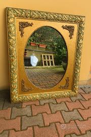 Specchio d’epoca con cornice ornamentale riccamente decorata, finitura oro/verde. Un oggetto di grande fascino, ideale per ambienti classici, shabby chic o boutique. Perfettamente conservato, pronto da appendere o appoggiare. Ottima occasione per chi cerca un complemento d’arredo elegante e di qualità. Misure: 97,5x77,5.