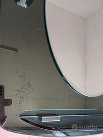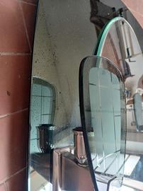Specchio da bagno con cornice in vetro specchiato verde scuro, 2 punti luce e mensolina in vetro. misure 83cmx63cm. presenta alcune macchie tipiche del tempo.