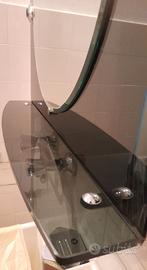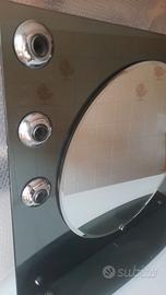 Specchio da bagno vintage con mensola in vetro fumè design anni 70 e porta lampadine a vite attacco piccolo, dimensioni 72 x 62 x 4 cm, mensola 11 cm.