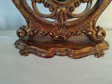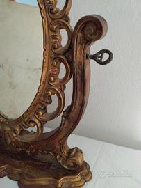 Specchio da mobile in legno basculante/girevoleanni '60/'70 in stile barocco riccamente decorato. In buone condizioni, ma la superficie riflettente mostra lievi segni del tempo. Sul retro compare il marchio "Depose Italy 143" ed il logo di un "Ragnetto". Misure: altezza cm 41 - larghezza massima cm 31 - altezza interna cm 24 - larghezza interna cm 13 - base cm 28 x 14.