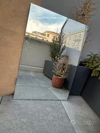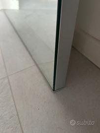 Specchio da parete largo cm 59 e alto cm 64. Spessore cm 2,5. Con retrostante pannello di supporto in agglomerato ligneo e bordatura metallica. In detto pannello sono inseriti due dispositivi regolabili, per posizionare la specchiera su ganci fissati a muro. Condizioni molto buone. Bologna zona Ospedale Maggiore. Euro 19,00