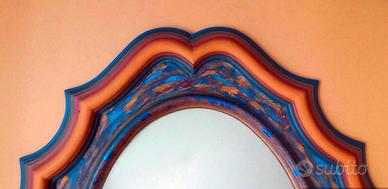 Specchio da parete con cornice sagomata in legno originario degli anni '70. Pezzo unico di artigianato ridipinto a mano e rivisitato in chiave moderna con l' uso di colori ad acqua atossici. Realizzato in diverse tonalita' di colore con pennellate dense di vernice e con tecnica 'a secco'.