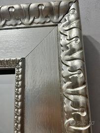 Specchio grande da parete 190x90 cm con cornice argentata decorata in stile classico elegante.