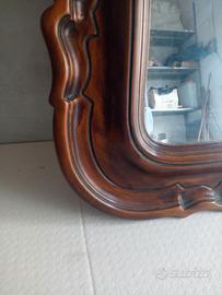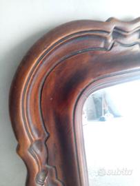Specchio in cornice di legno massello decorato, dimensioni della cornice ingombro massimo: 83cm x 68cm. Le misure interne della cornice, cioè dello specchio: 61cm x 47cm
