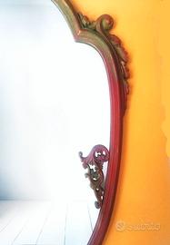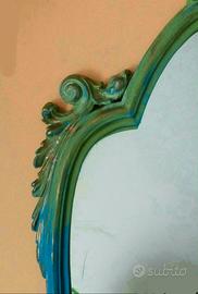 Specchio con cornice in legno sagomata. Specchio in stile Barocco originale degli anni '60 . Specchio colorato a mano. Pezzo di artigianato unico per la tua casa, reinterpretato in chiave moderna con colori ad acqua Tonalita' di colore accese e contrastanti in stesura assimetrica.